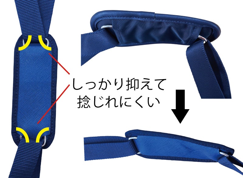 腕を通すと自然とパッドが「渡り」のような役割をしてくれるので、首も肩もラクで、実際持ってみると重さが「半減以下」に感じるのです。肩、背中、お腹に重さが分散するからなのです。