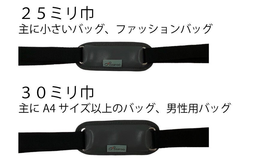 25ミリ幅と30ミリ幅の2種類です。25ミリ幅はファッションバッグや小さめのバッグに、30ミリ幅は大きいバッグや男性の方におススメです。