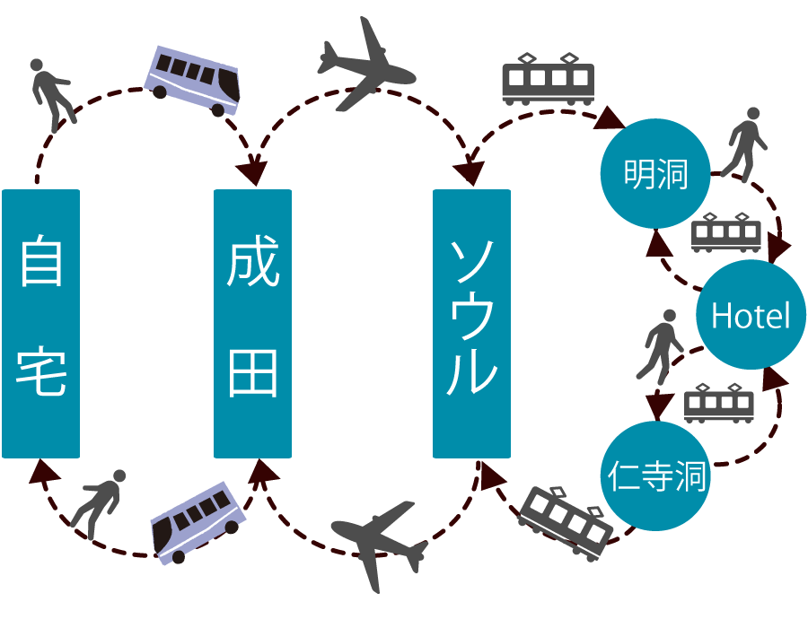 現地に着くまでいくつかの乗り物を乗り換えることも多く、例えば吉祥寺からソウルへの2泊だと、こーんなに色々乗ることに! 電車だと立ちっぱなしもしばしば、改札や売店ではモノの出し入れで忙しく。コアルーの前抱えだと、長時間立っていても重く感じにくいし、チケットも財布もさくさく出してぱぱっとしまえます。