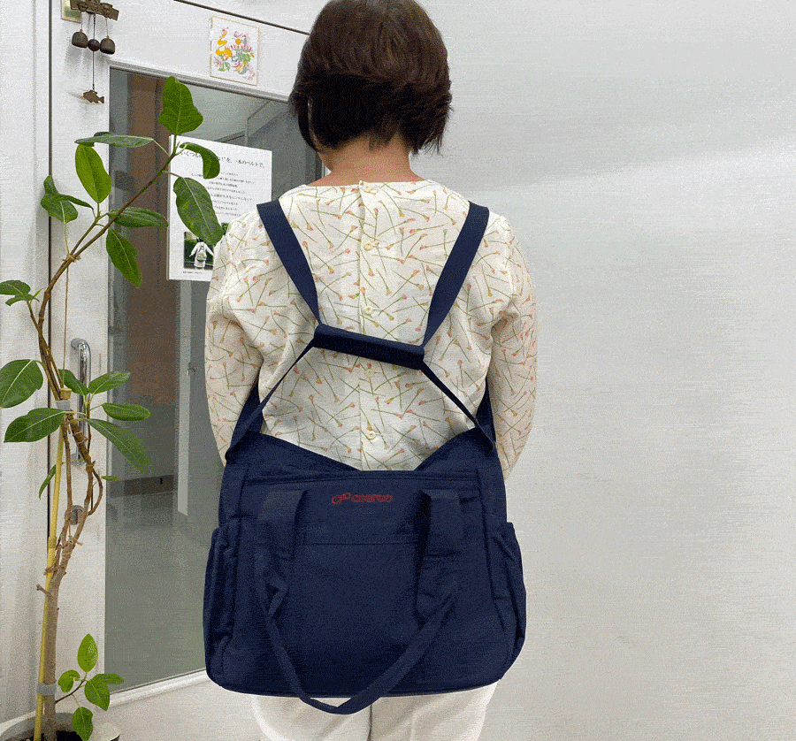 見慣れないリュックスタイルで、「重く感じるのではないか?」「ぐらぐらするのではないか?」と疑問を抱きがちですが、ショルダー掛けで片方に負担をかけている状態から比べると両肩に分けるためラクに。普段の荷物だとリュックタイプとあまり差を感じない方も多く、ベルトの食い込みに関しても同じのようです。でもぐんと重い場合には本格的なリュックのほうが軽く感じますのでリュックとの併用もおススメです。