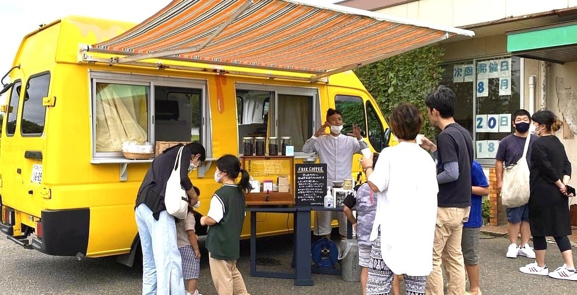 店舗を持たない僕たちは、黄色いキッチンカーにコーヒー道具を持ち込み、淹れたてのドリップコーヒーを無料で振舞う「フリーコーヒー(お振舞いコーヒー)」と信頼する農家さんから直接仕入れた食材を使った「焼き菓子」の販売を行なっています。