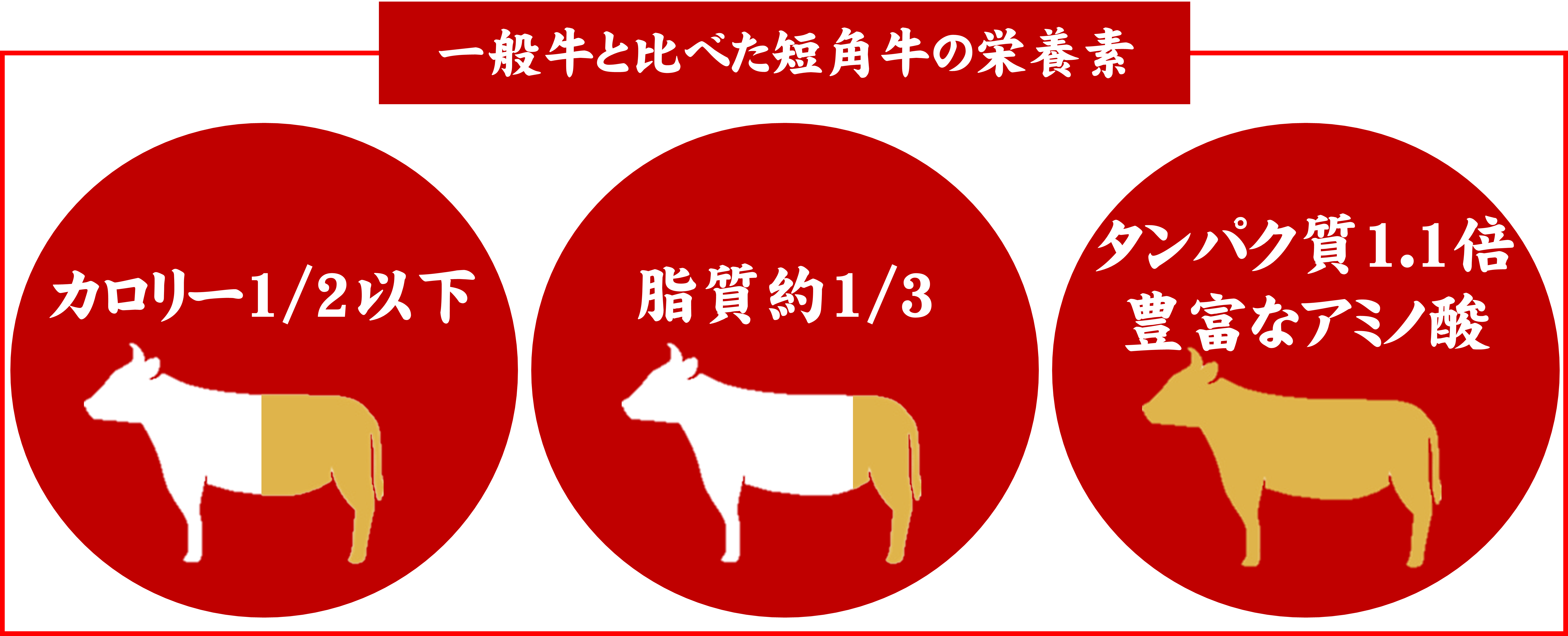 一般牛のカロリーは半分以下、脂質は約1/3、タンパク質は約1.1倍、そして豊富なアミノ酸が含まれており、