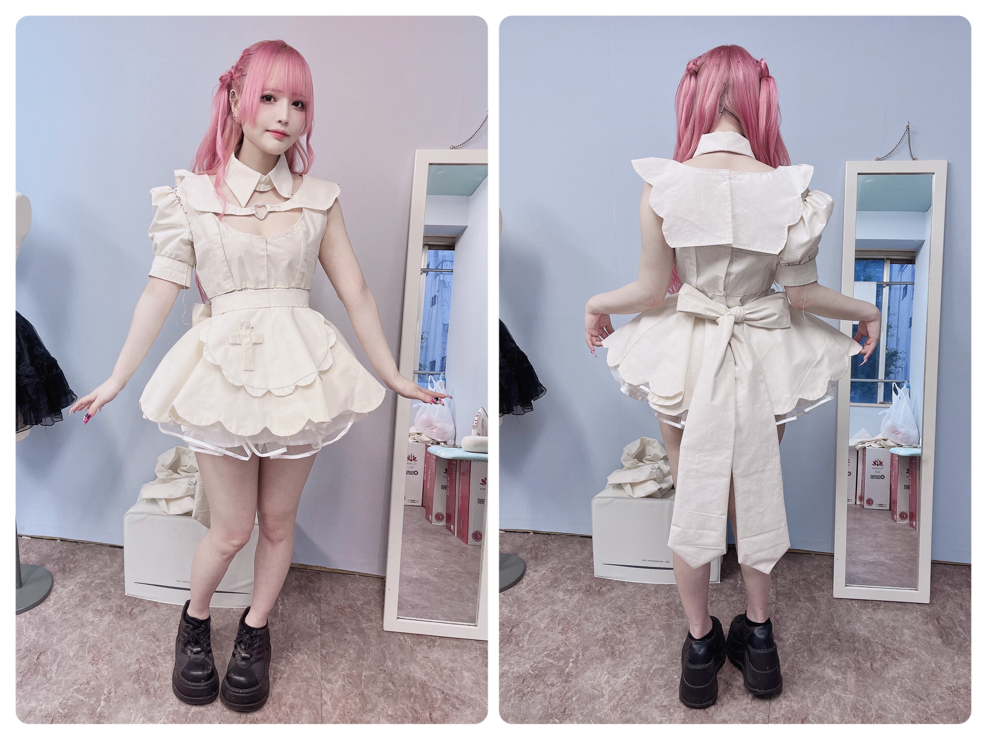 お洋服にこだわりがあったしきみちゃんをリスペクトしてシルエットにこだわり、スカートはとても短く胸元も大きめに開けて、可愛くてスタイルが良く見えてちょっぴりセクシー♡な仕上がりを目指しました。