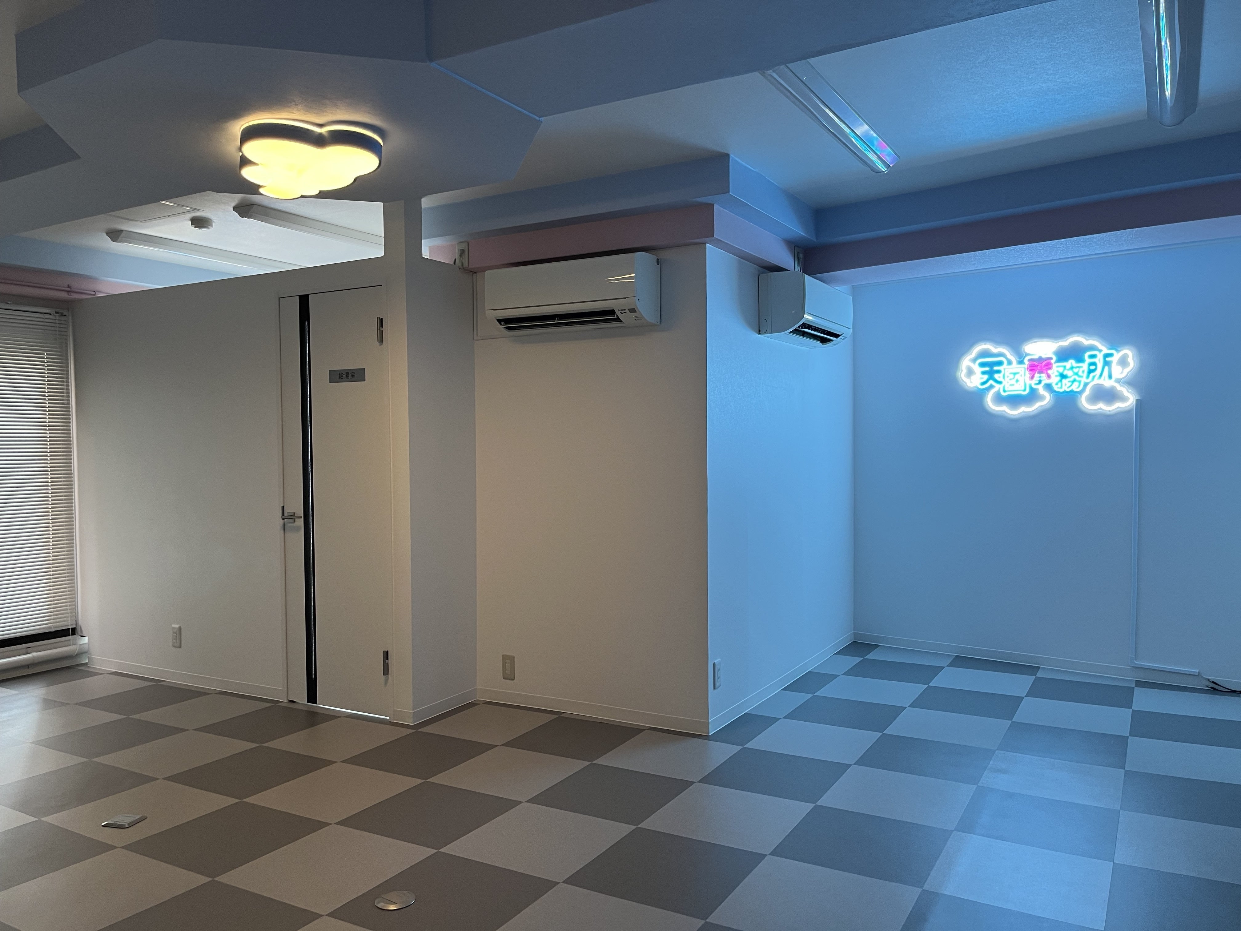 店内は白基調で水色とピンクのネオンサインを飾り、オフィスのような雰囲気と可愛さを掛け合わせた空間を目指しています。