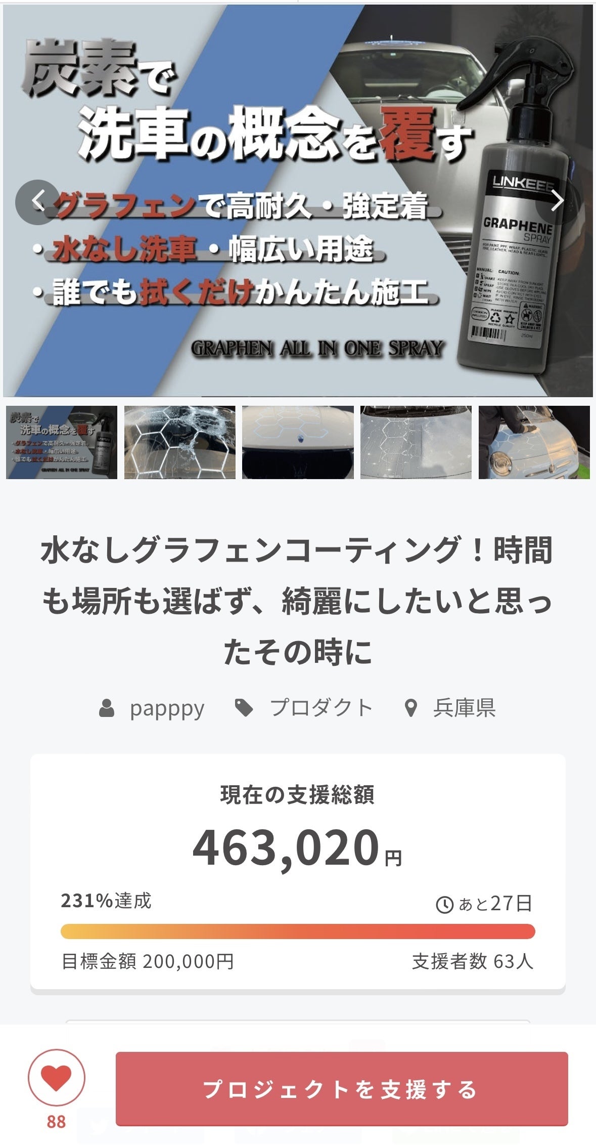 皆様こんにちは!開始直後よりたくさんのご支援や応援のお言葉、本当にありがとうございます。おかげさまで目標達成率が230%を超えました!ご支援者様の情報拡散のご協力や温かいメッセージ、心より感謝いたします。支援者数が増えていくたびに、この商品をより多くの方へお届けできるためとても嬉しく思います。数々の応援コメント、心温まるお言葉、活動レポートでの返信になり大変恐縮ですが本当に励みになっております。重ねて御礼申し上げます。次の目標は、「支援総額100万円」です!厚かましいお願いではございますが、引き続きグラフェンオールインワンスプレーのご支援と応援、何卒よろしくお願いいたします!
