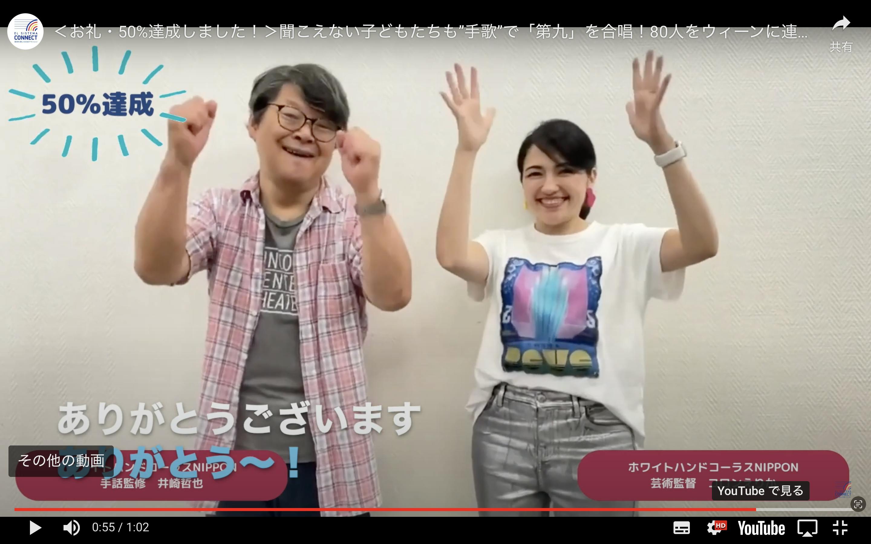 おかげさまで、目標金額の50%達成しました!コロンえりかと、ホワイトハンドコーラスNIPPONで手話監修をしてくださっている日本ろう者劇団顧問の井崎哲也先生よりお礼メッセージをお送りいたします。