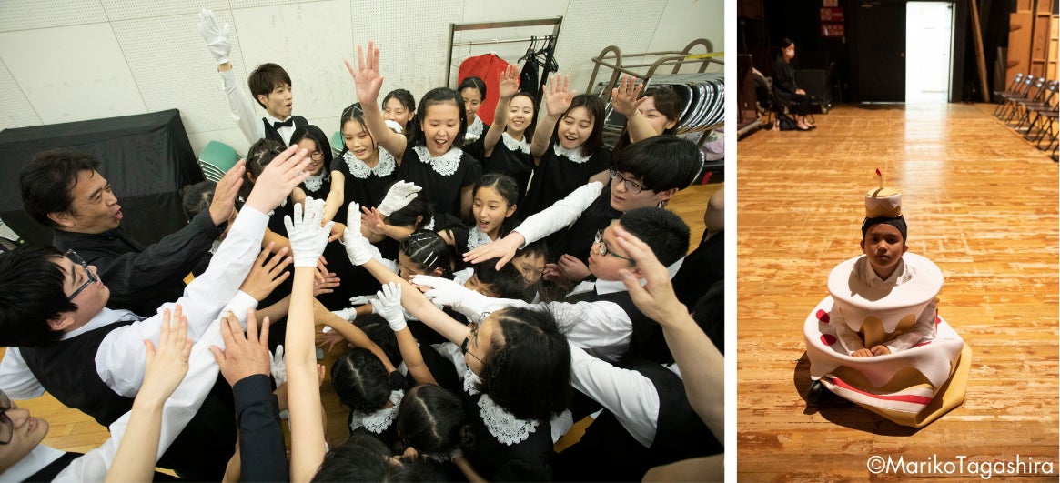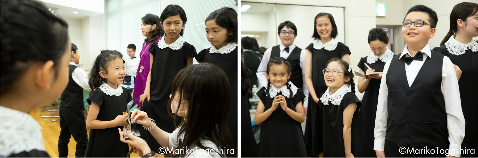今回のコンサートでは、東京と京都のメンバーが一堂に会しました。京都のメンバーは早朝から新幹線で駆けつけ、普段はZOOMを使って練習しているため、久々の直接の再会にメンバー同士が喜びを分かち合っていました。本番前には、髪を整えたりお化粧をしたりするために保護者が手伝います。