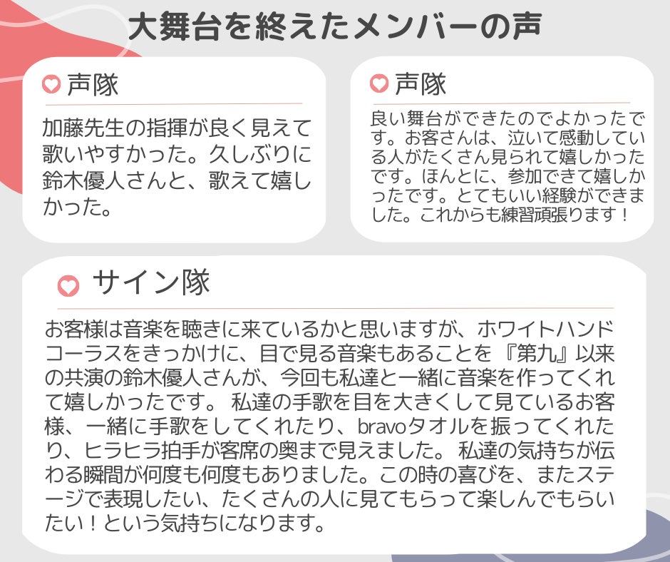 引き続き、ホワイトハンドコーラスNIPPONへのご支援とご声援をよろしくお願いいたします。(保護者より)