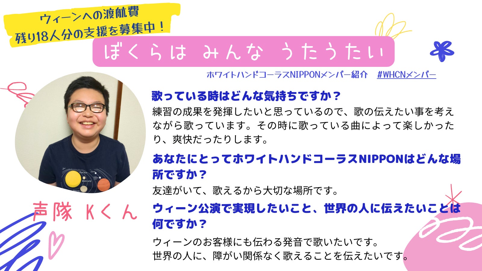 ホワイトハンドコーラスNIPPONメンバーの子どもたちもウィーンに向けた練習が本格的に始まり、「第九」のシラーの歌詞の意味理解や表現の難しさに向き合っております。(練習風景の活動報告)真剣に練習をすればするほど楽しく、そしてウィーンへの期待も高まるメンバー達のインタビューを、今日から数回に分けてご紹介させて頂きます!