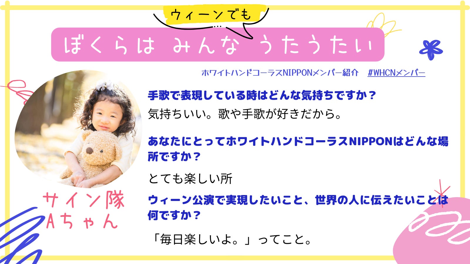 Aちゃんは約一年前からホワイトハンドコーラスNIPPONに参加しています。昨年はまだ未就学児で、東京メンバー内では最年少でした。冬の練習日、暖かいスタジオで気持ちが良くなったのか、練習中にお昼寝してしまうことも。そんな愛らしい様子に、その場に居合わせたメンバー全員が癒やされました。ホワイトハンドコーラスのお姉さんたちが大好きで、みんなからは妹のような存在として、可愛がられています。そんな愛されキャラのAちゃんにインタビューをしました!