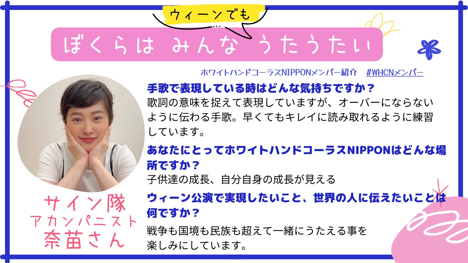 アカンパニスト(伴奏者)としてホワイトハンドコーラスNIPPONを支えてくれている奈苗さん。聾の俳優でもある奈苗さんの手歌は、指先まで意識したしなやかな動きと、歌詞に合わせて自在に変化する顔の表情が魅力的です。