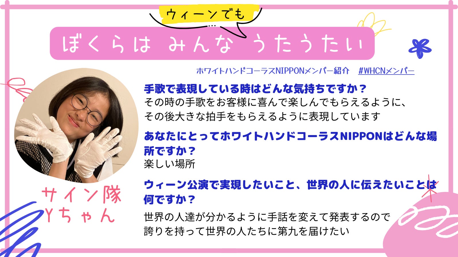 100人100通りの考えがあり、多種多様な生活を送る中で障害に対しての考えは様々だと思います。ですが、ホワイトハンドコーラスの活動で、インクルーシブな世界が広がり、支えてくださっている皆様からの力を胸に、ウイーンでも大きく羽ばたき、バリアフリー社会への大きな一歩を切り拓き、社会という大海原に旅立つ時もマイナスイメージをプラスに変える力を備え、たくさんの経験をして幸せな人生を送って欲しいなと切に願っております。