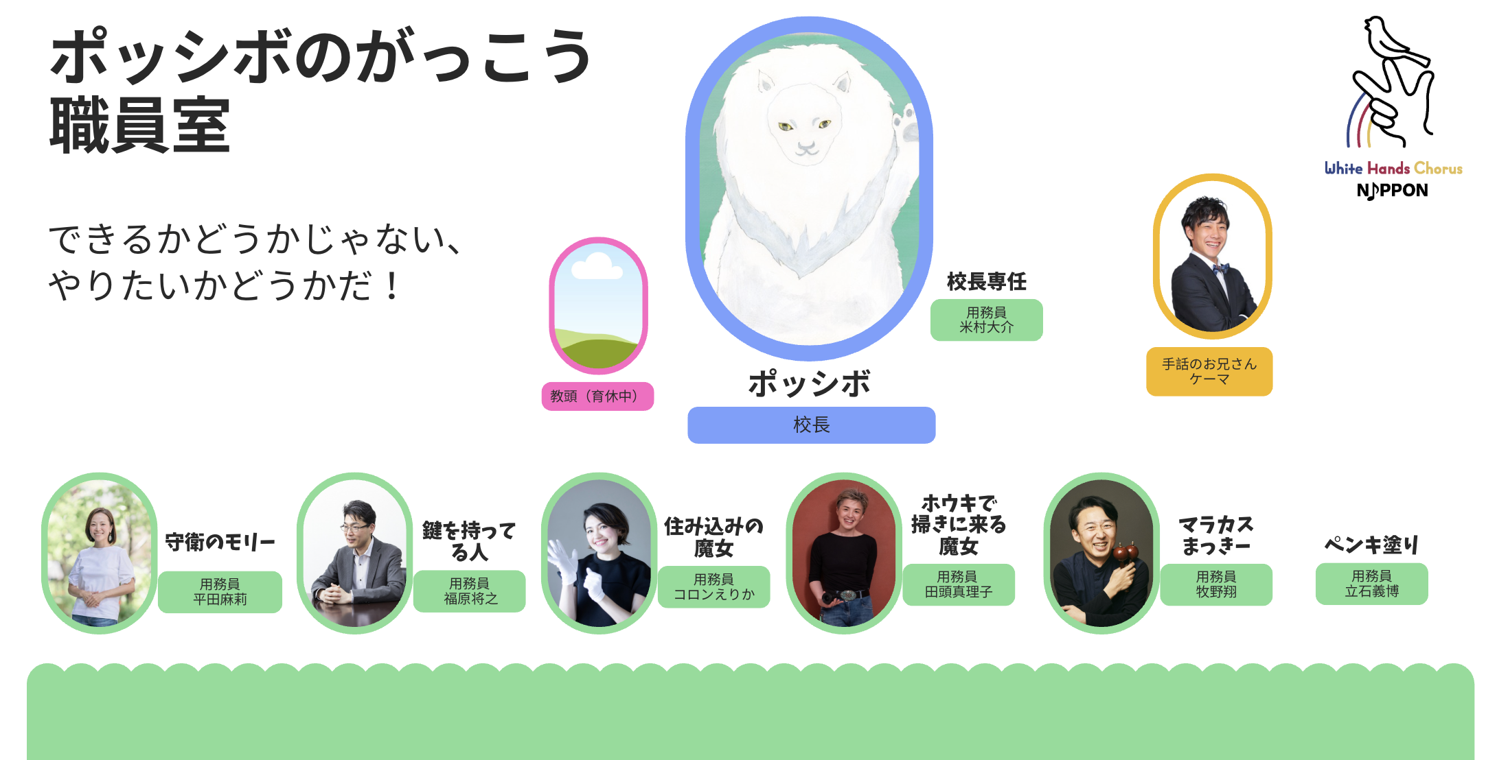 ポッシボ(Possible)は、ホワイトハンドコーラスNIPPONがつくった絵本”ミルとキクとポッシボ”に登場する、ホワイトライオンのしょうがいのあるかみさまです。口癖は、「できるかどうかじゃない、やりたいかどうかだ」。https://mirukikupossible.jp/