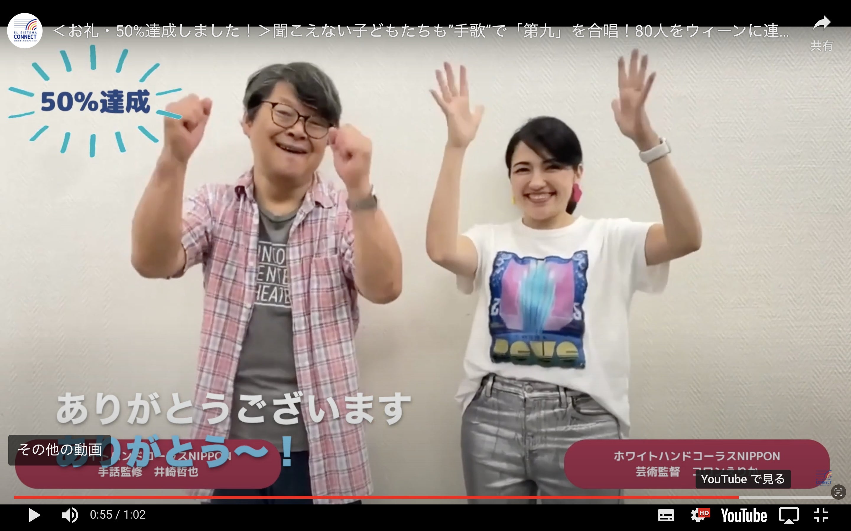 おかげさまで、目標金額の50%達成しました!コロンえりかと、ホワイトハンドコーラスNIPPONで手話監修をしてくださっている日本ろう者劇団顧問の井崎哲也先生よりお礼メッセージをお送りいたします。みなさまは「ありがとう」の手話をご存知でしょうか?今回の動画では「ありがとう」の手話表現の解説付きでお届けします。井崎先生の空間を使った素晴らしい日本手話のお話もお楽しみください。