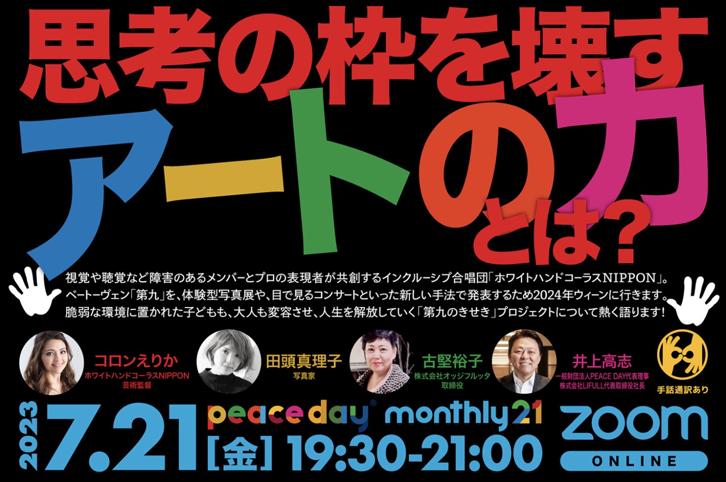 <イベント出演のお知らせ>7月21日(金)19:30〜オンラインイベント「PEACE DAY monthly 21」にコロンえりかと田頭真理子が出演いたします。「PEACE DAY monthly 21」とは、一般財団法人PEACE DAY様が毎月21日に開催されているイベントで、社会課題解決に向けて取り組んでいるゲストの方々と、参加者との対話を通じて、平和を信じる一人ひとりの想いと行動をつなぎ、パートナーシップで実現する仕組みをつくっていくことを目的としています。7月のテーマ「思考の枠を壊すアートの力とは」にゲストとして、コロンえりかと田頭真理子が参加させていただくことになりました。「第九のきせき」プロジェクトについて熱く語ります!みなさま、ぜひご参加ください!■日時:7月21日(金)19:30~21:00■開催形式:オンライン(Zoom)■参加費:無料■主催:一般財団法人PEACE DAY■イベント詳細https://peaceday.jp/pdmonthly-21_2307/▼お申し込みはこちらhttps://pdmonthly20230721.peatix.com
