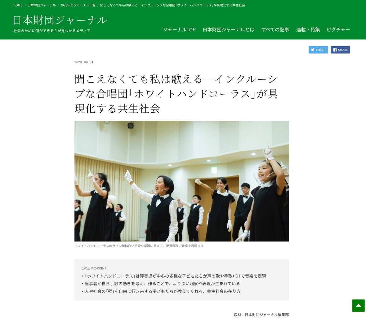 ホワイトハンドコーラスNIPPONの活動及び「第九のきせき」プロジェクトが、「日本財団ジャーナル」に掲載されました!「日本財団ジャーナル」にてコロンえりかのインタビューが掲載され、ホワイトハンドコーラスNIPPONが表現を生み出して行く上で大事にしていることや、「第九のきせき」が実現したい目標などが紹介されています。丁寧な取材で素晴らしい記事にしてくださいました。メンバーたちの生き生きとした練習風景も見どころです。ぜひご一読ください。「日本財団ジャーナル」2023年8月1日聞こえなくても私は歌える—インクルーシブな合唱団「ホワイトハンドコーラス」が具現化する共生社会