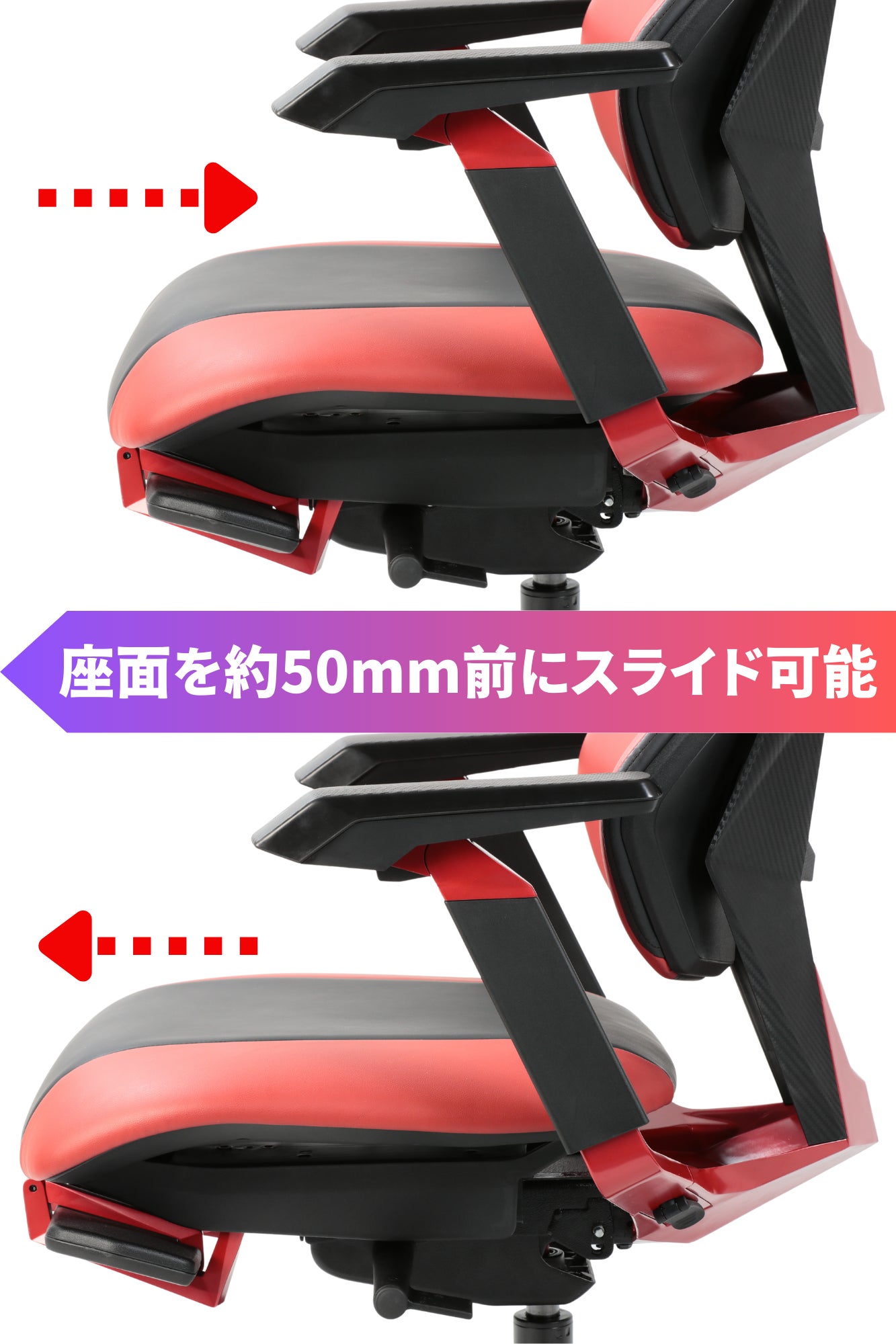 座面を前方にスライドすることで座る面積が広げ、