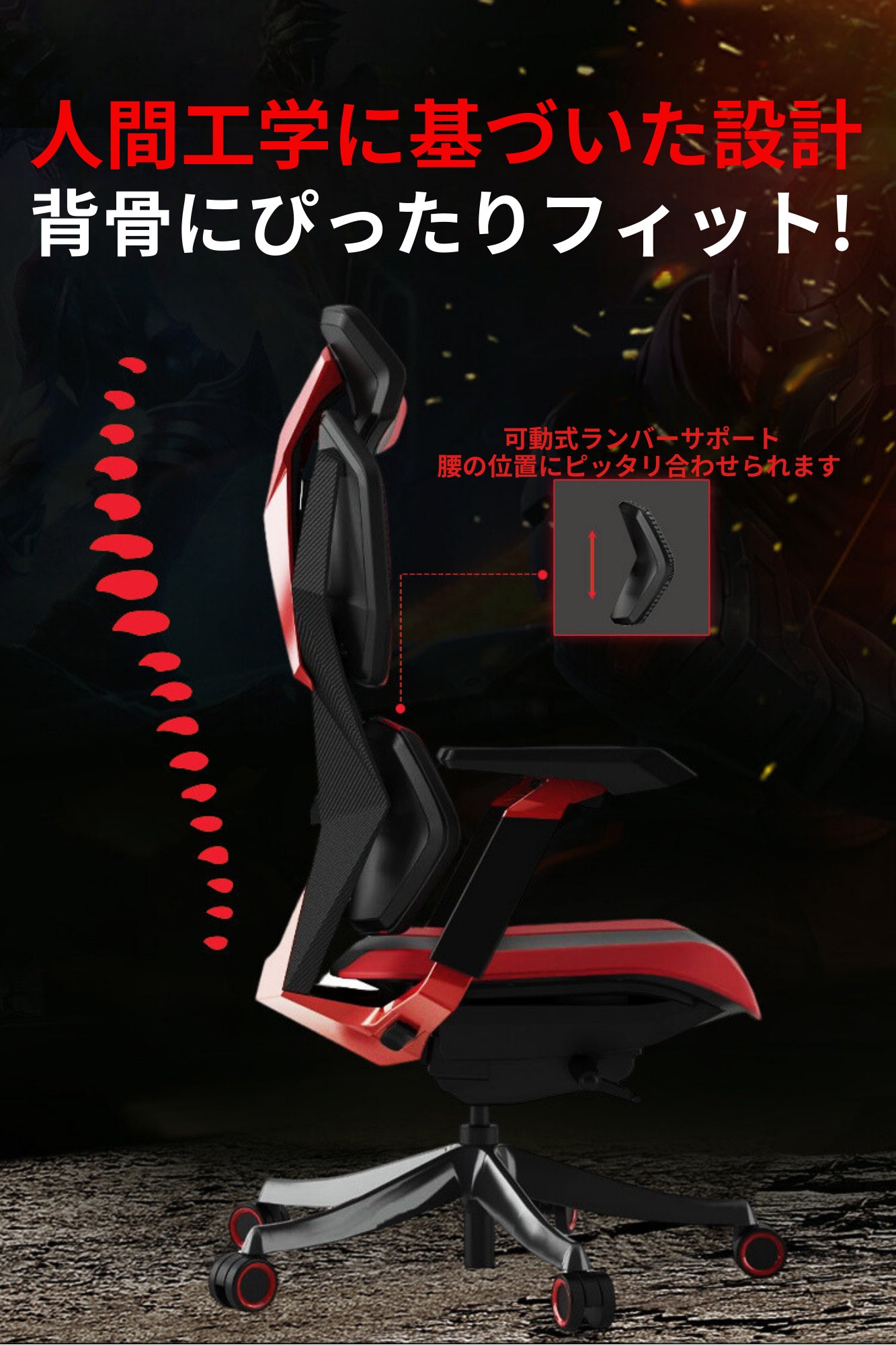 ・背中の通気性を向上させるメッシュデザインのバックレストにより、長時間の使用でも快適さを維持します。夏場でも涼しく過ごせる設計で、ゲーミングからオフィスワークまで幅広く対応します。