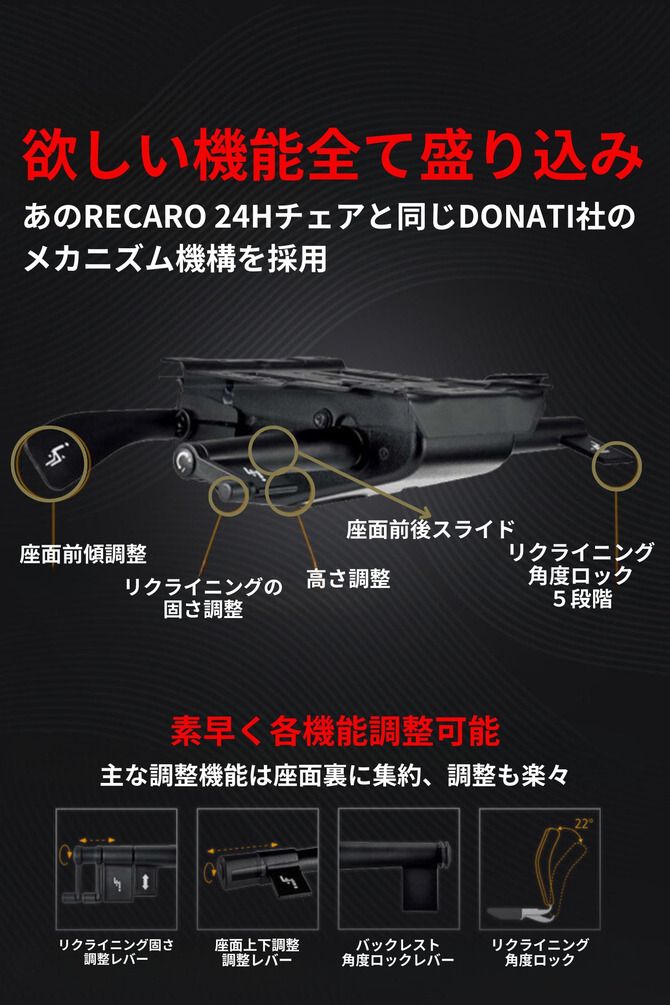 あぐらかくことも出来ちゃいます。 TG-01ゲーミングチェアは、あのRECARO 24Hチェアと同じイタリアDONATI社が提供するメカニズム機構を採用しており、必要な機能を全て盛り込んでいます。