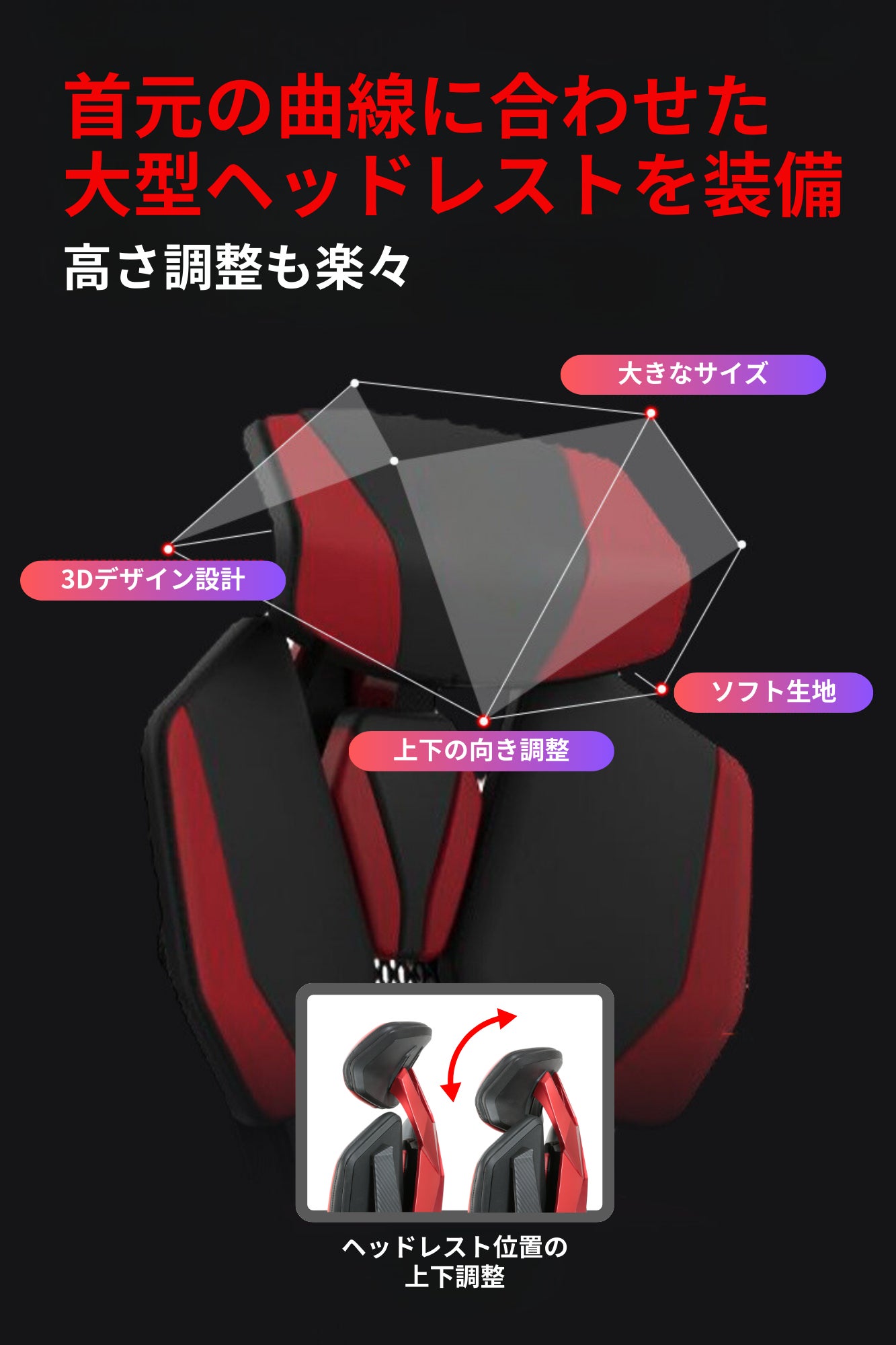 ・TG-01ゲーミングチェアは、首元の曲線にぴったりと合う大型可動式ヘッドレストを備え、その高さ調整も容易に行えます。