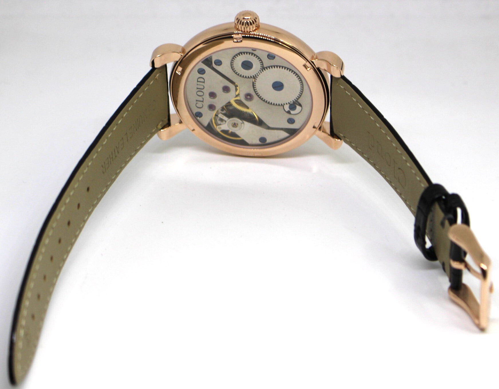 ご自分で組み上げたムーブメントをご覧いただけるように、裏蓋をシースルー(平面形状)にいたしました。