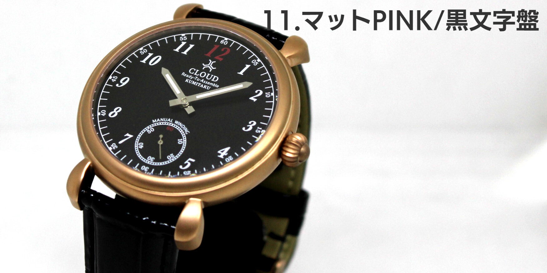 11.マット仕上げされたSSケースにK18ピンクゴールドメッキを施し、黒文字盤を合わせました。