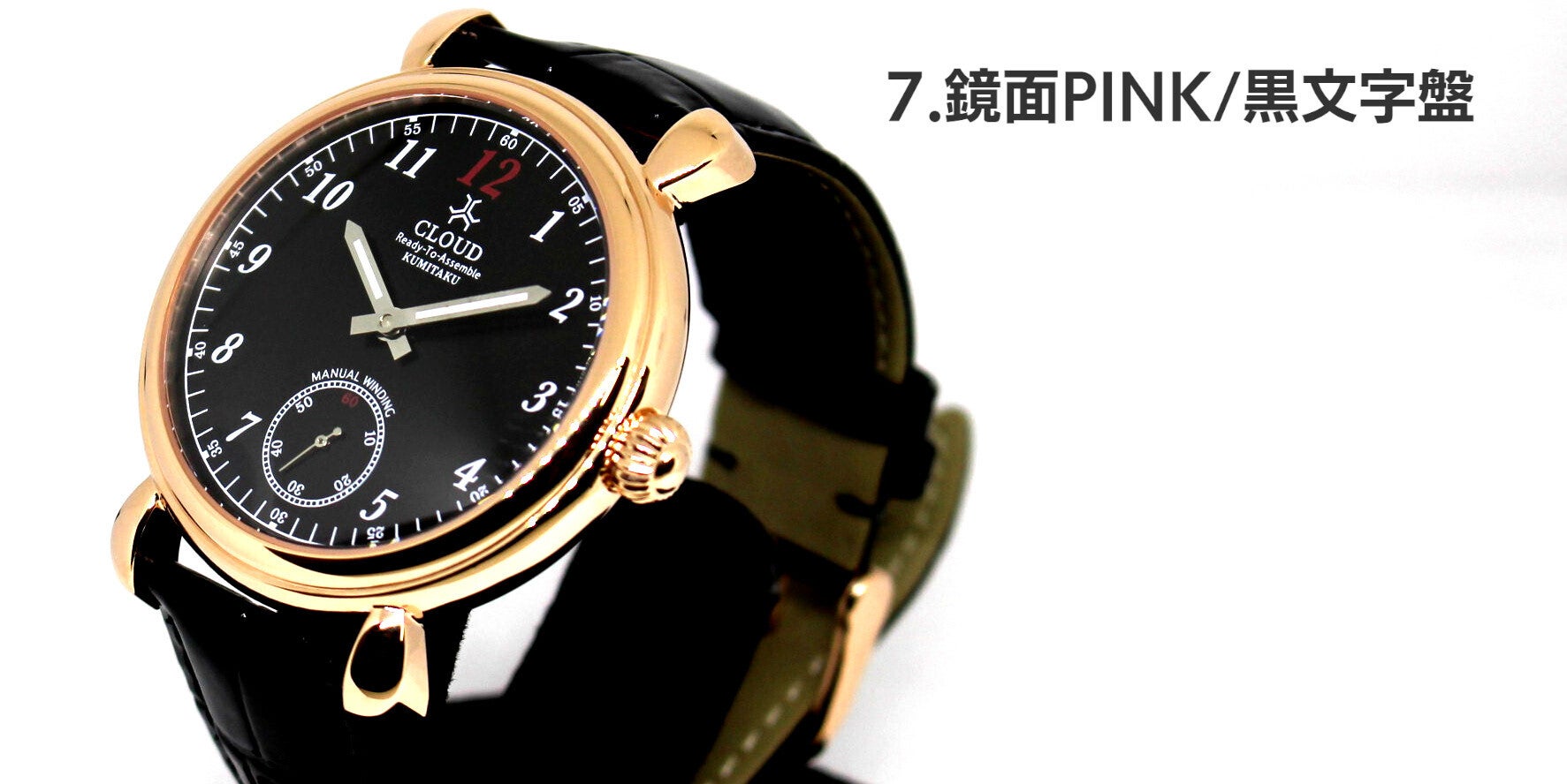 7.鏡面仕上げされたSSケースにK18ピンクゴールドメッキを施し、黒文字盤を合わせました。