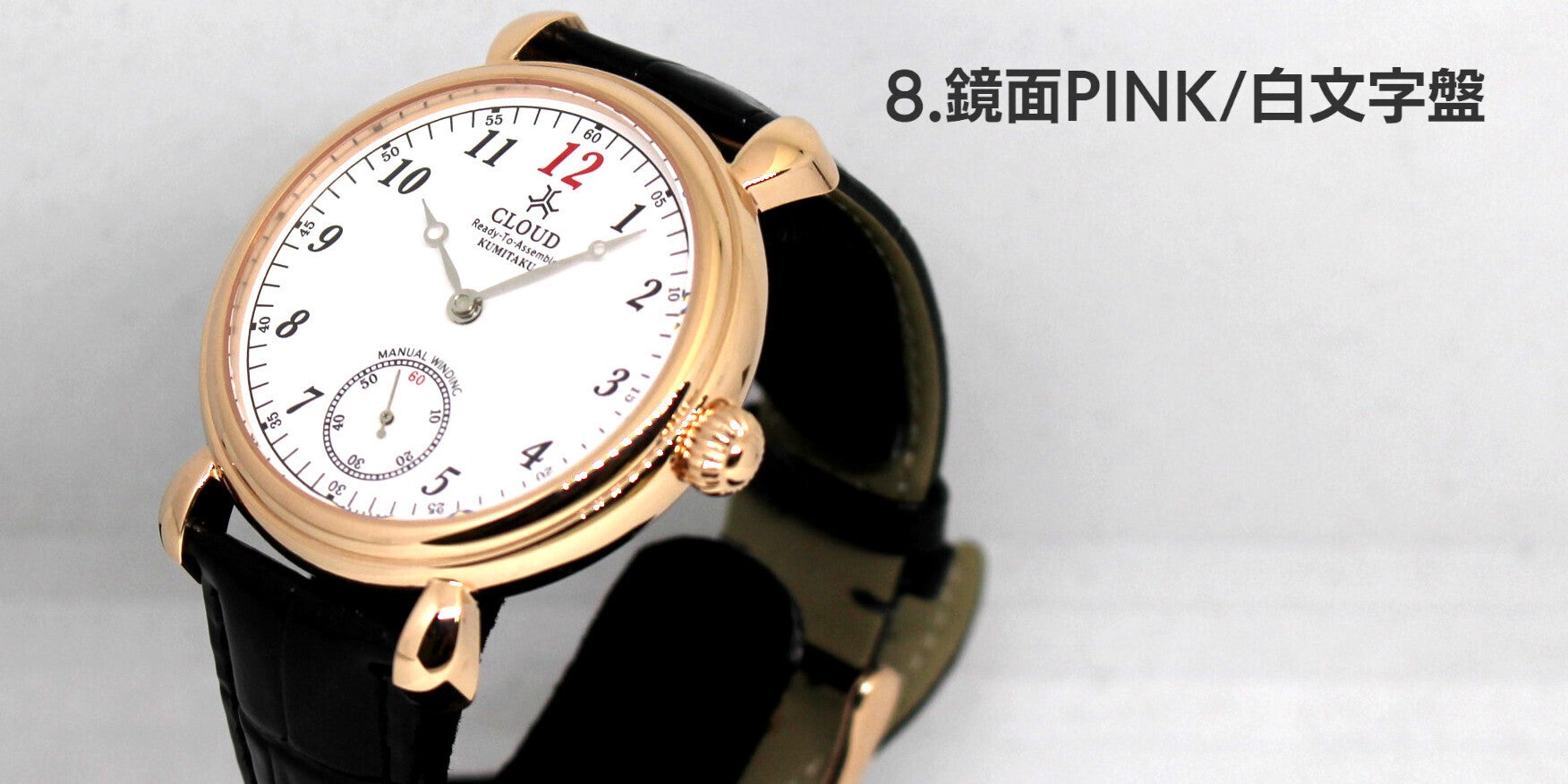 8.鏡面仕上げされたSSケースにK18ピンクゴールドメッキを施し、白文字盤を合わせました。