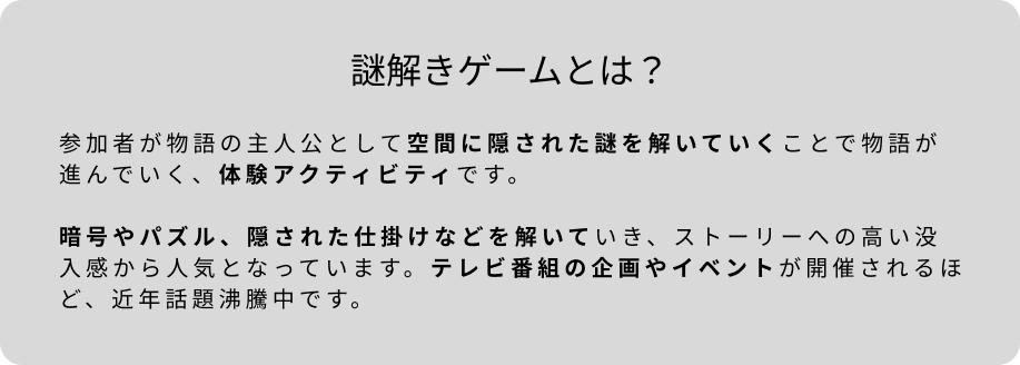 宿泊を伴う体験を制作する、ホテルズミステリー様とコラボレーションをして通常の宿泊プランの他に謎解き体験付きプランをご用意します。