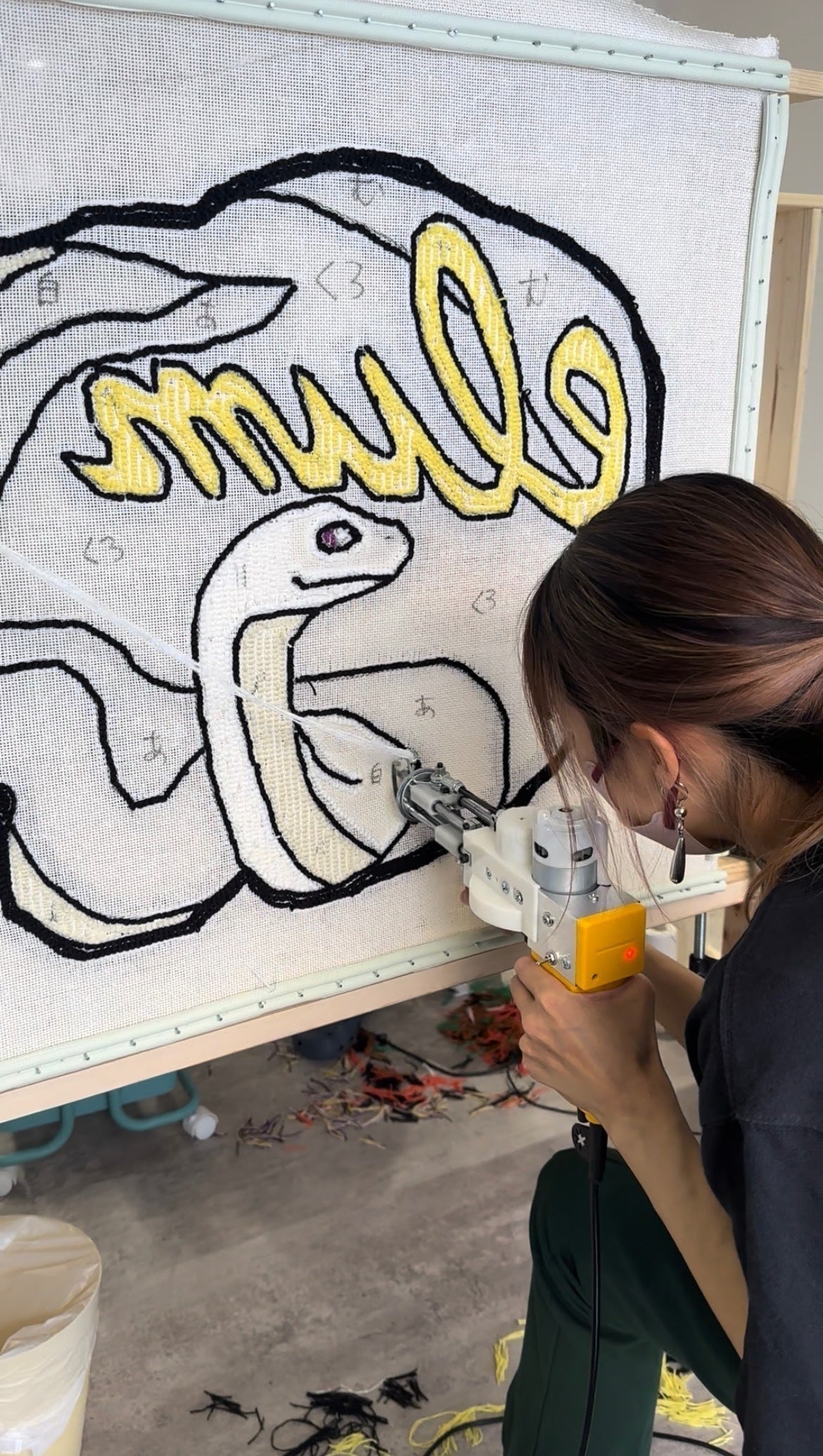 専用の機械(タフティングガン)を使用して、布に毛糸を打ちつけていき、ラグなどを製作します。
