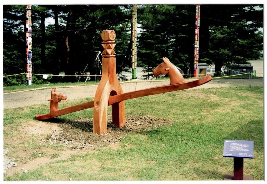 当公園がある南砺市井波地域は木彫刻が盛んで、4年に一度世界中から彫刻家を招いて木彫刻作品を作る「国際木彫刻キャンプ」というイベントが開催されています。今回再生するシーソーは28年前の第二回木彫刻キャンプでハンガリーの作家によって作られたものです。