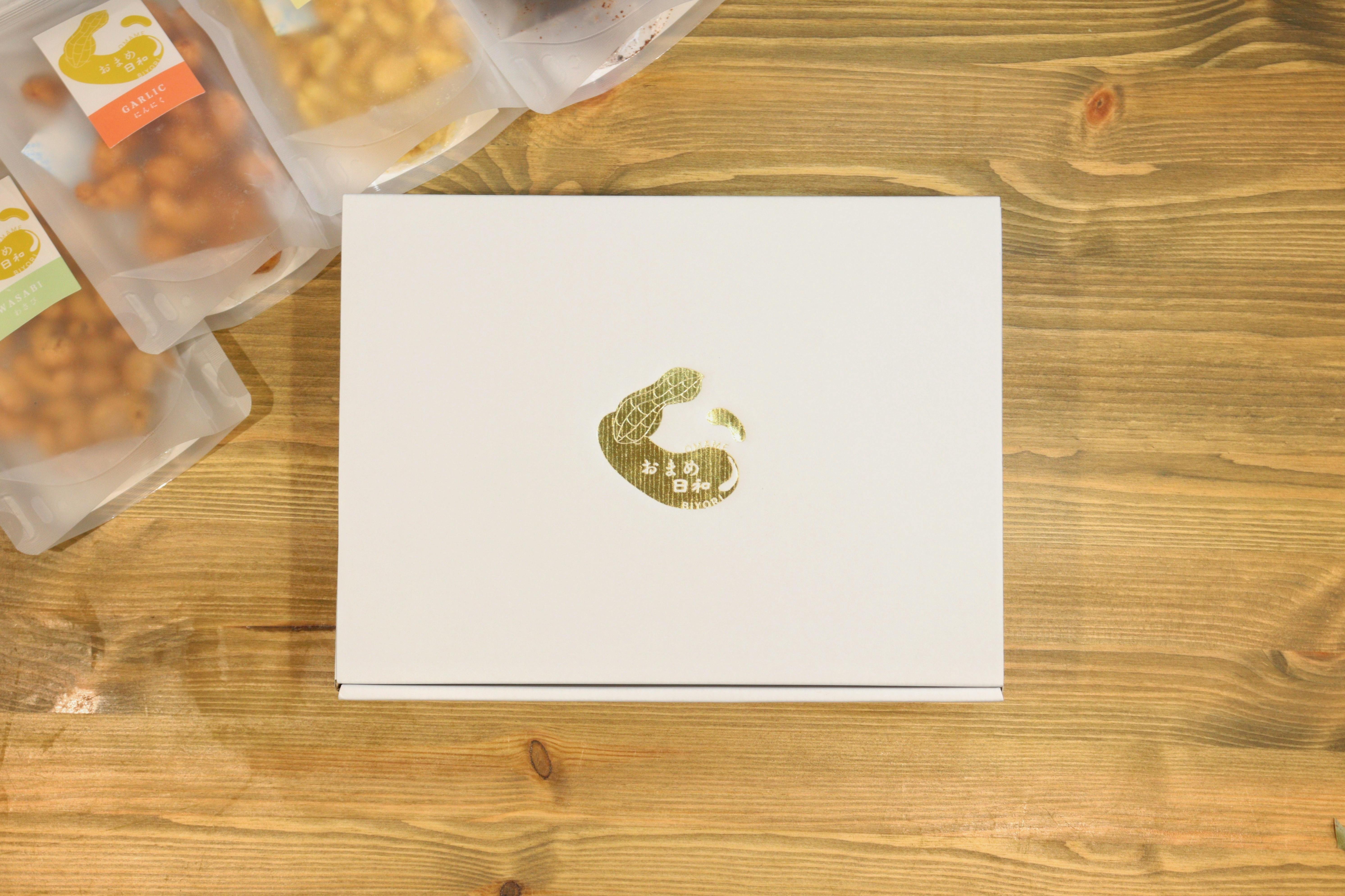 ・会社様ロゴデータをお預かりし、「おまめ日和」ロゴとのオリジナルコラボパッケージ仕様にてギフトボックス製作