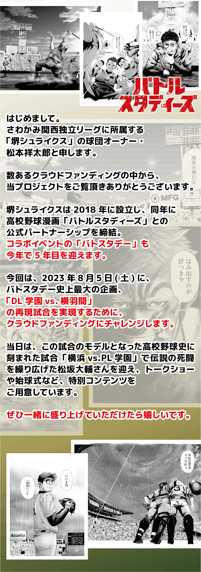 大西監督となきぼくろ先生の元PL学園という繋がりもあって、堺シュライクスは同年に高校野球漫画『バトルスタディーズ』との公式パートナーシップを締結しました。