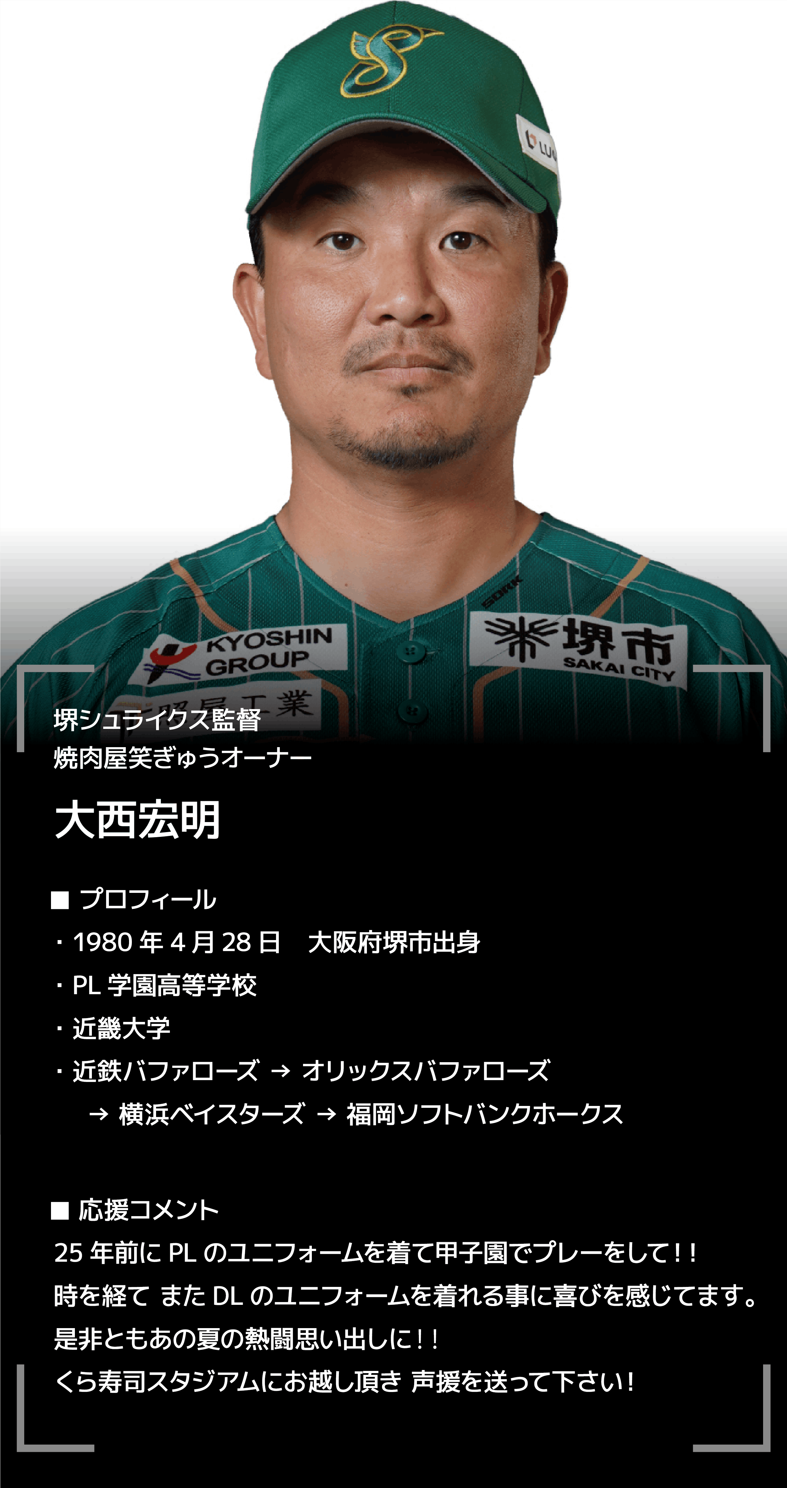 それから20年後の2018年、大阪堺市を拠点とする独立リーグ球団「堺シュライクス」が誕生し、私が球団オーナーとして就任しました。初代監督はあの伝説の一戦の立役者・大西宏明。