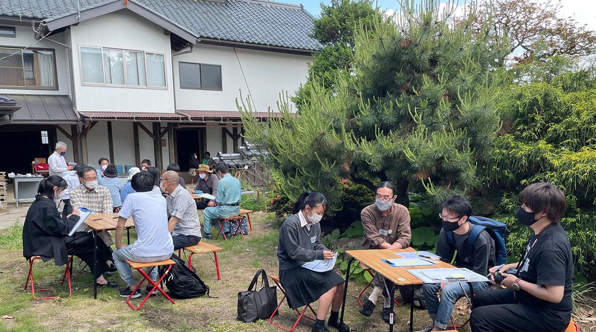 米澤邸の庭で利活用を話し合うワークショップ 背景は長屋門