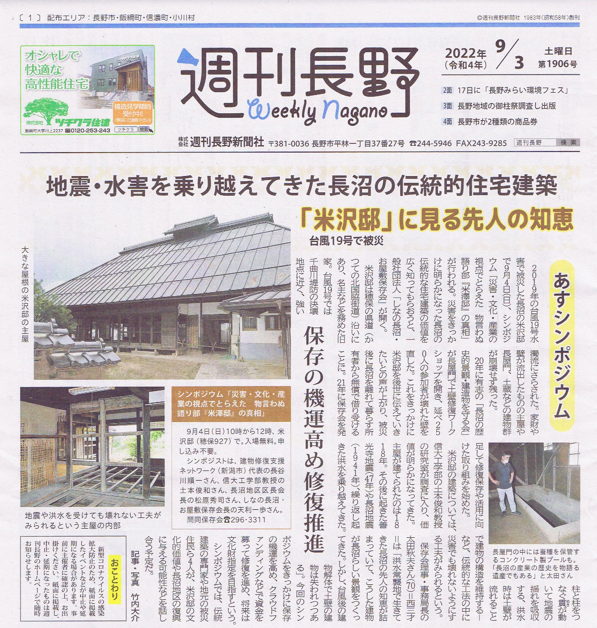 昨年(2022年)9月には「災害・文化・産業の視点でとらえたもの言わぬ語り部米澤邸の真相を探るシンポジウム」を実施し、新聞で事前に報道されたこともあり、70名を超す参加がありました。米澤邸を後世に遺すことの意義と利活用について鮮明にされました。