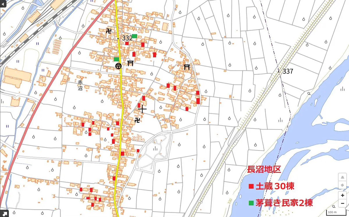 支援活動の中で出会った建物修復支援ネットワークの長谷川順一さんから、長屋門の土壁を修復するワークショップをやってみないかと呼びかけられました。長沼に現存している古民家や土蔵の調査をし、地図に落とし込んでみました。それが長沼の特徴的な景観になっていること、水害の常襲地帯では伝統的な建築様式が活かされていたことを知りました。