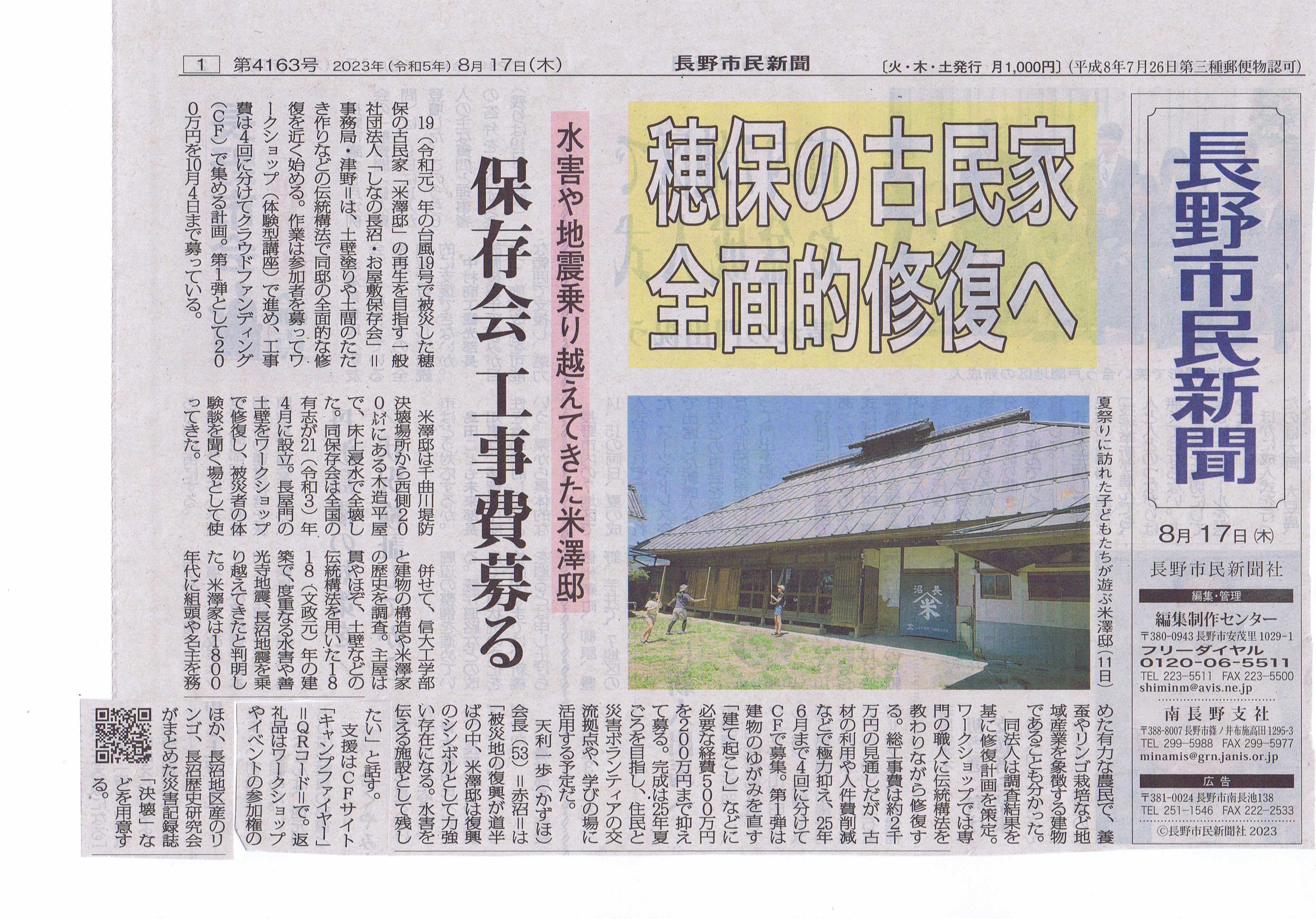 2023/10/03 13:55信濃毎日新聞 被災から4年を経過する200年前の古民家「米澤邸」の修復再建は、新聞各社も注目してくれました。長野市民新聞、信濃毎日新聞、読売新聞で取り上げてもらいました。 募集締め切りは目前となりました。支援者の紹介で新たな支援者が現れるという動きが急速に広がってきており、感謝に堪えません。支援者の紹介が輪を広げることになっていると強く感じています。 これまでの支援者のみなさんに御礼申し上げるとともに、ぜひ周囲の方への呼びかけやSNSでのシェアをいただけるとありがたいです。残りの期間はわずかですが、最後までお訴えを続けてまいります。よろしくお願いします。 もっと見る天利会長ラストの訴え & 来訪者の感想インタビュー