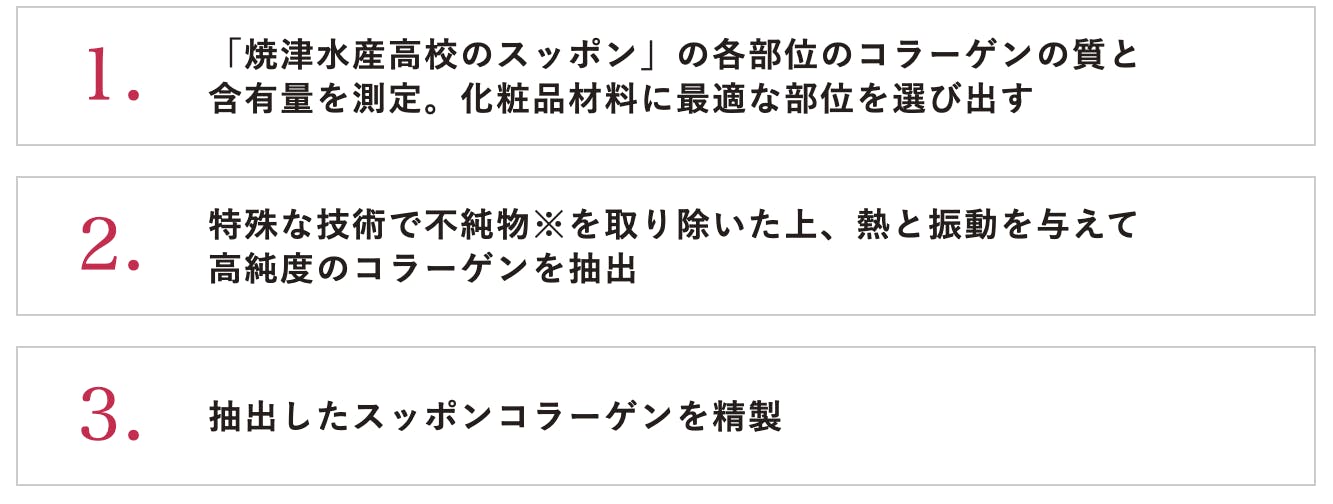 焼津水産高校のすっぽんを研究した結果、純度がほぼ100%に近いロングレングスコラーゲンを開発することに成功しました。これが、安全試験をクリアしたことを確認した後、クロモンコスメティックスの誕生につながりました。