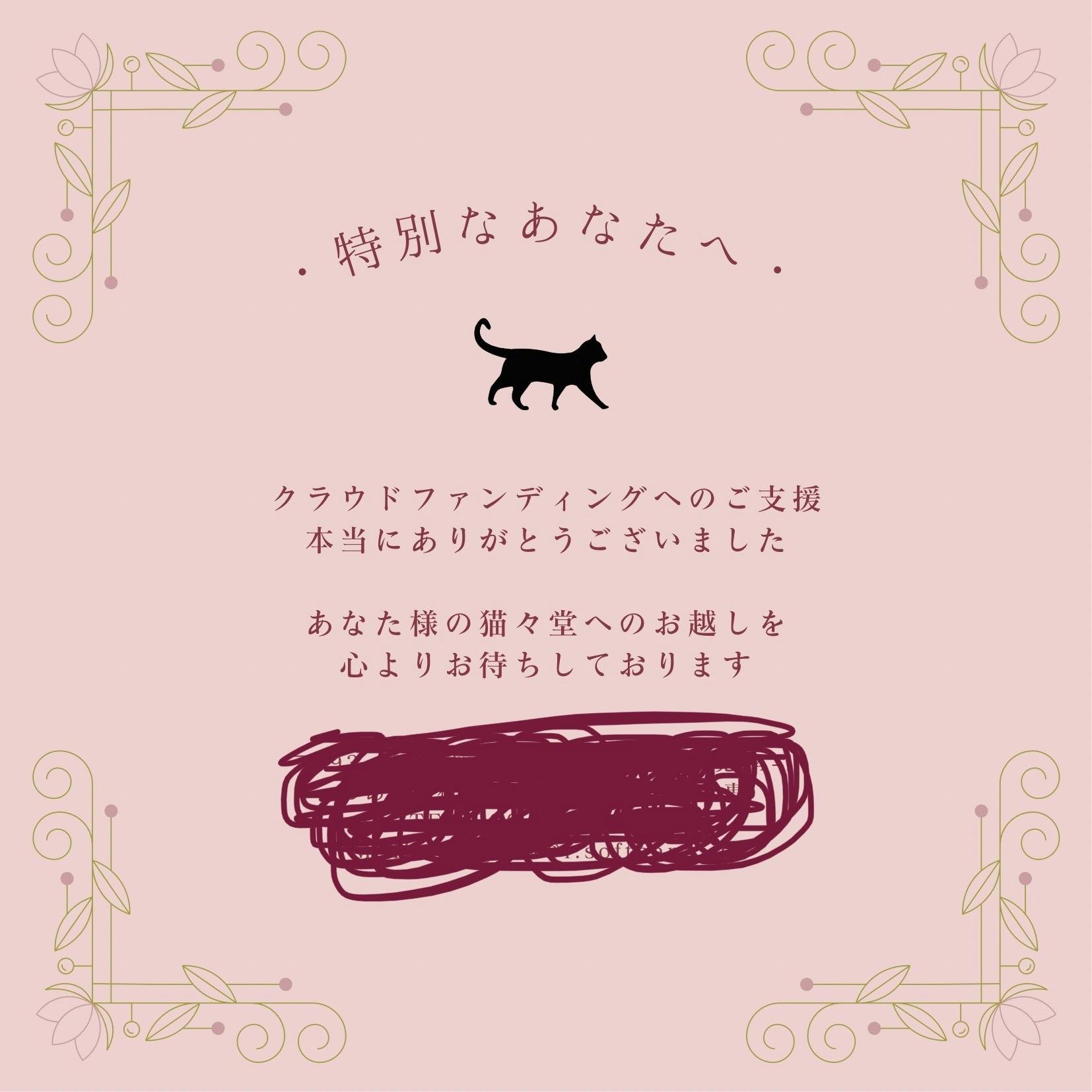 2023/10/28 13:50プロジェクト内では10月〜発送としていたリターンですが、資金集めのため思いの外日々忙しくしてしまい、10月も末になってやっと、発送の目処がつきました。また、猫々堂物件もやっと購入できる資金を調達でき、契約が進み、あとは売主様側の署名を待つだけの段階ですので、ただ今より、4月のOpenに向けて鋭意準備を進めて参ります!!リターン発送が当初の予定より遅くなっておりますこと、近況のUPがしばらく途絶えておりましたこと、心よりお詫び申し上げます。これからまた少しずつ、マメに近況をお知らせしていけるよう調整して参りますので、今後ともどうぞよろしくお願い致します!! もっと見る皆さま、ありがとうございました!!