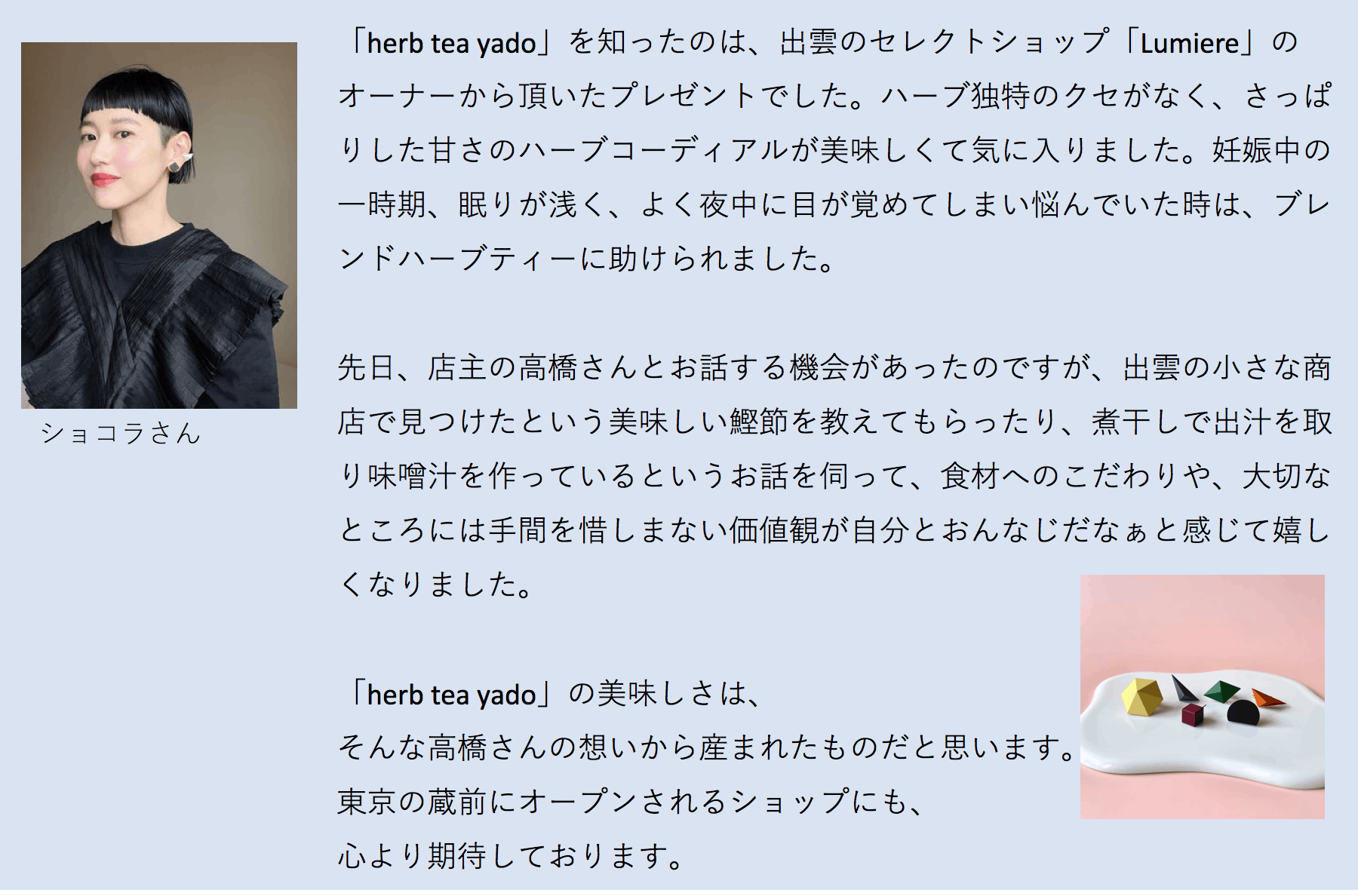 おいしいハーブティーで健康維持をするという習慣を多くの人に伝えていけるといいな、一人でも多くの人の助けになれたら嬉しいな、という思いで進んだ結果、「東京に新たな拠点を」という思いが生まれ、縁が生まれました。