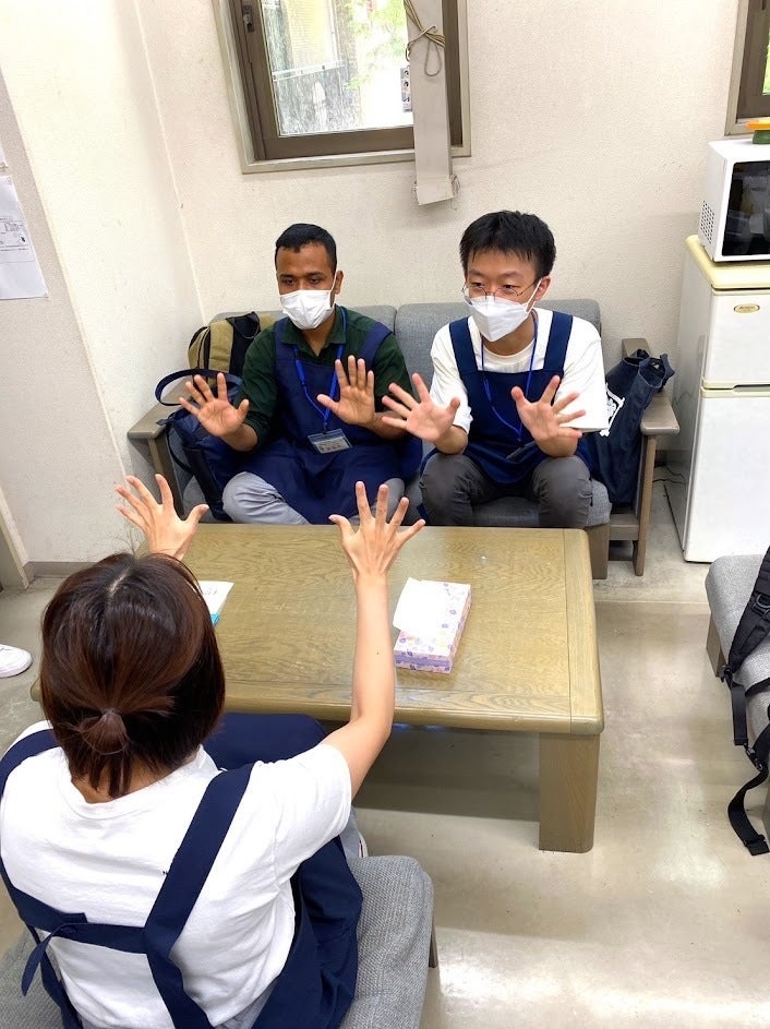 その次に、日本人なら小さい頃に誰もが一度は聞いたことのある「むすんでひらいて」の手遊びの練習をしました。留学生たちは、見よう見まねで練習していましたが、職員の方だけでなく、周りの日本人の方も一緒にやってるのをみて、こちらも少しずつ慣れていきました。職員の方にも、「おふたりとも、お上手です」と褒めてくださいました。