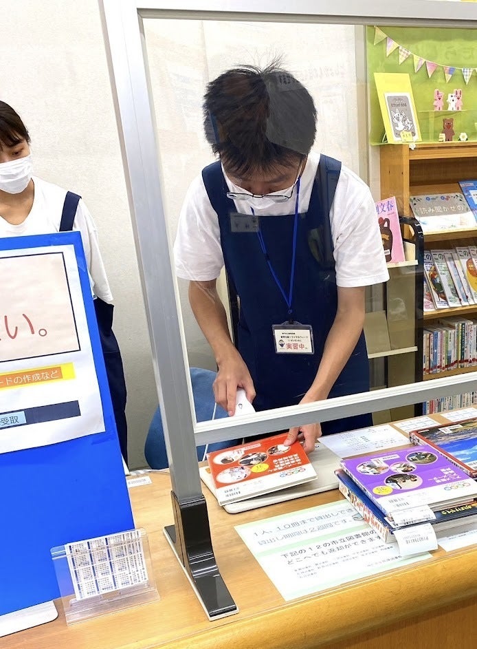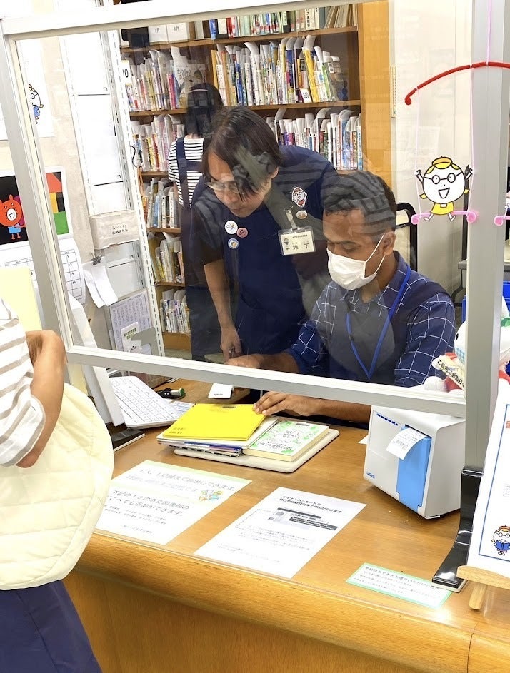 そして、最後に本の貸し借りの手続きの作業を体験しました。この日は土曜日だったこともあり、カウンターに来る方が多く留学生たちは少し忙しそうな様子でした。また、図書館のカウンターの仕事は本の貸し出し、返却だけでなく予約していた本の受け渡し、返却された本の仕分けなど仕事が多岐に渡り、留学生は「覚えることが多くて、ちょっと難しかったです」と話していました。
