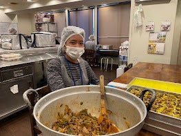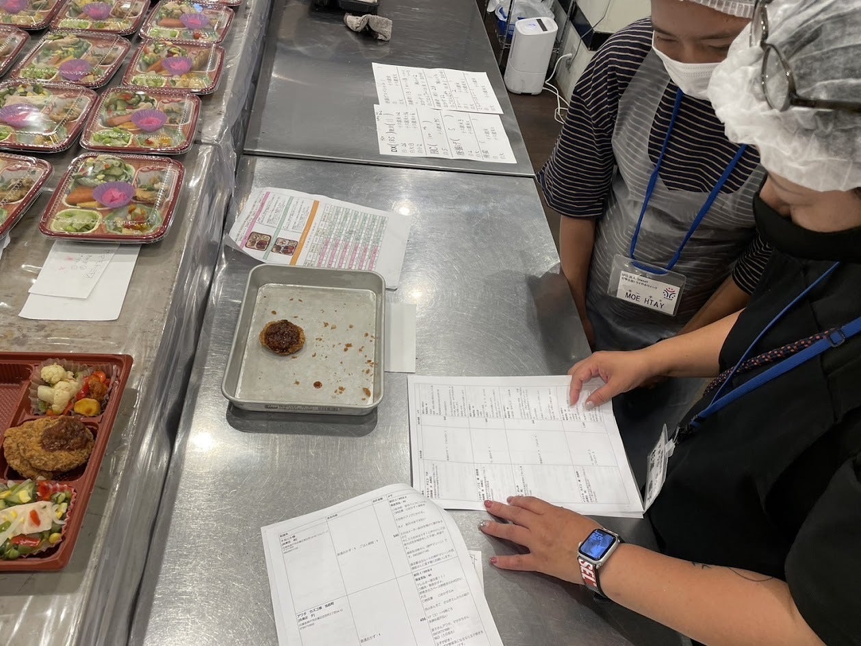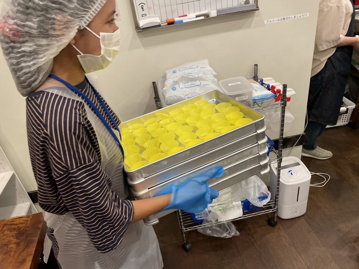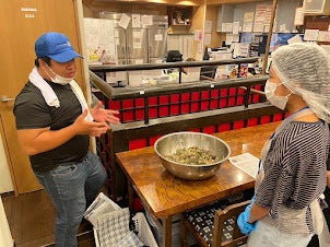 カップへの盛り付け業務が忙しくなってきました。留学生自ら手伝います!と声掛けして、計量しながらの盛り付け作業を始めました。3日目なので、慣れた手つきで、どんどん作業が進みます。