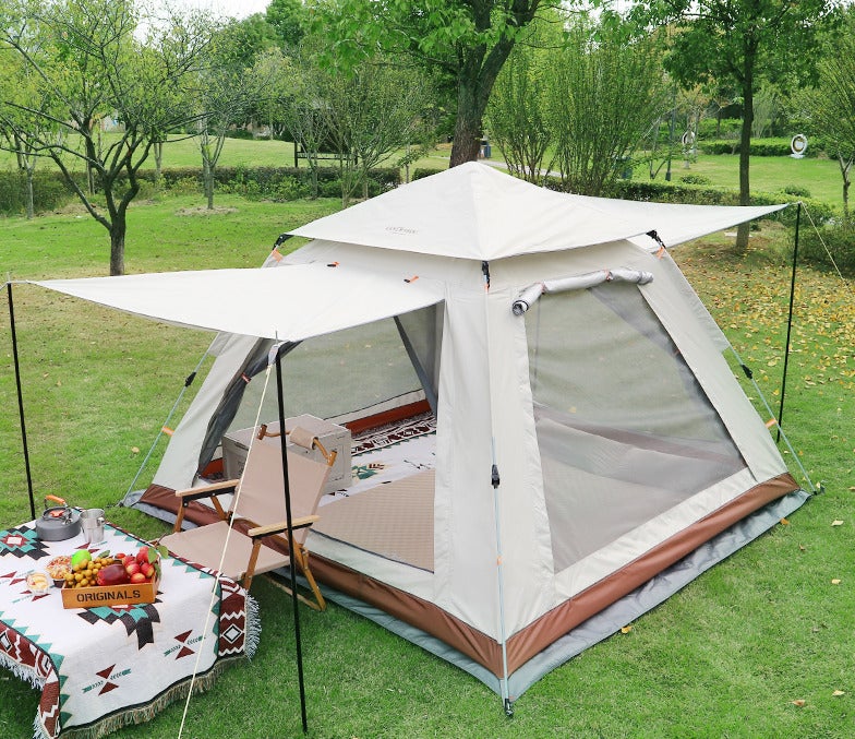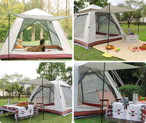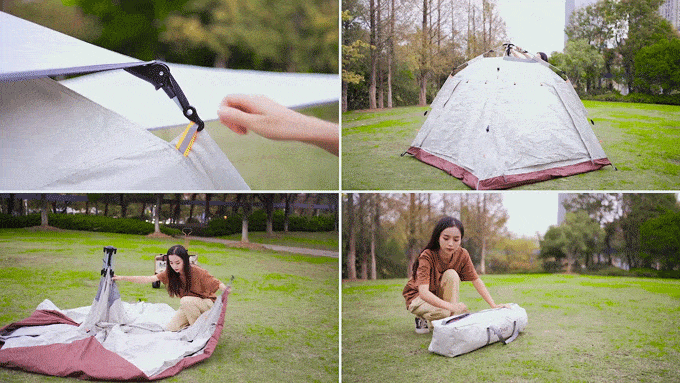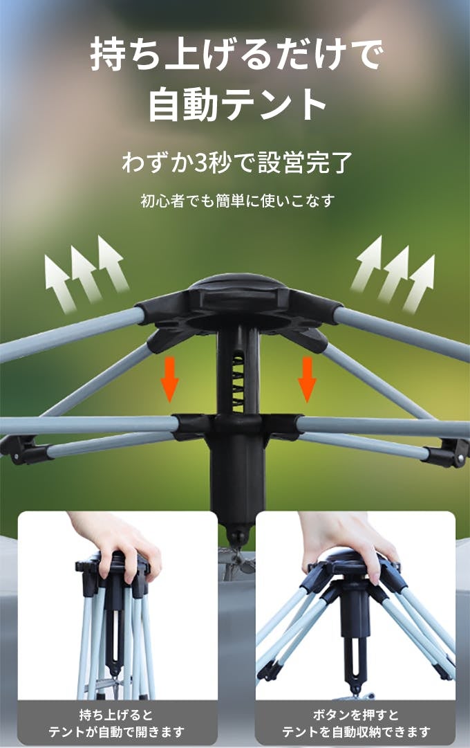 このテントは、自動収納・展開設計を採用しているため、非常にスムーズに収納・展開が行えます。たったの4ステップでテントを収納することができるため、簡単に片付けることができます。アウトドアでの利用において非常に便利です!