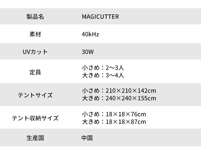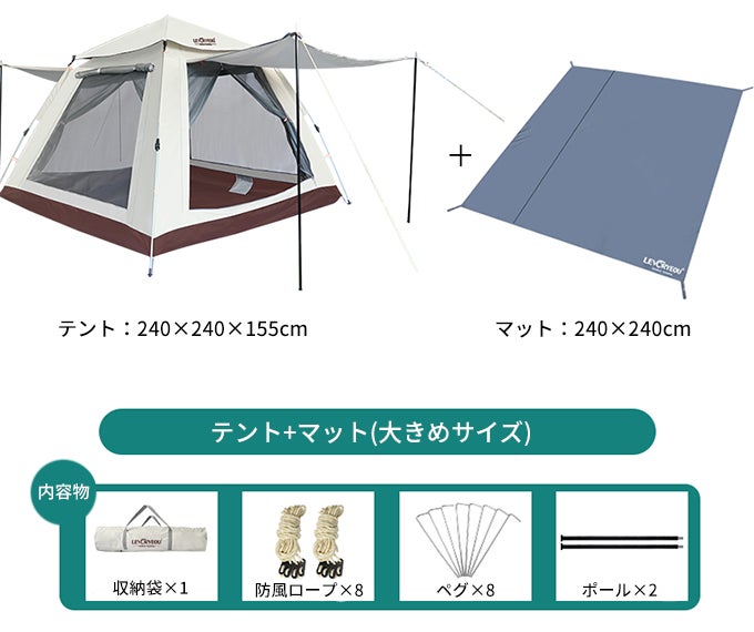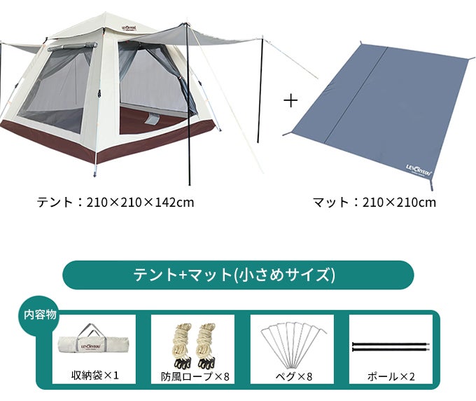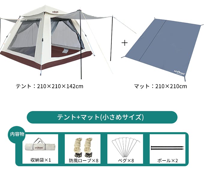 テントのサイズは210×210cm、240×240cmの2種類からお選びいただけます。