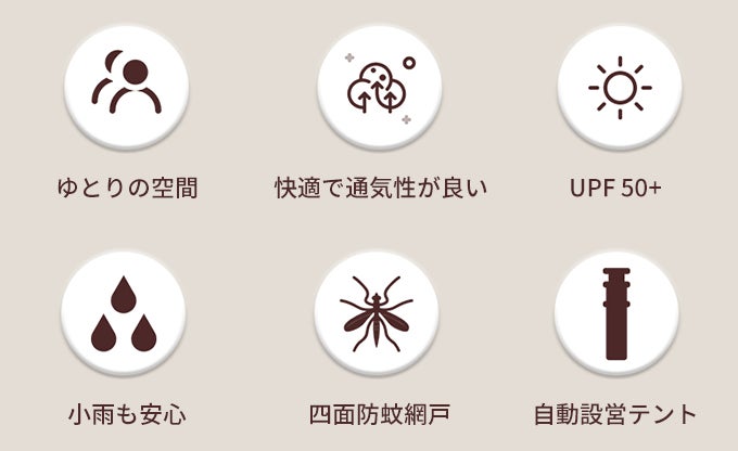 UVカット加工&網戸が搭載されているため、夏の暑さや冬の冷たい風、蚊などの害虫からも守ってくれます。また、突然の雨でも安心して使用できるよう、しっかりとした防水加工が施されています。