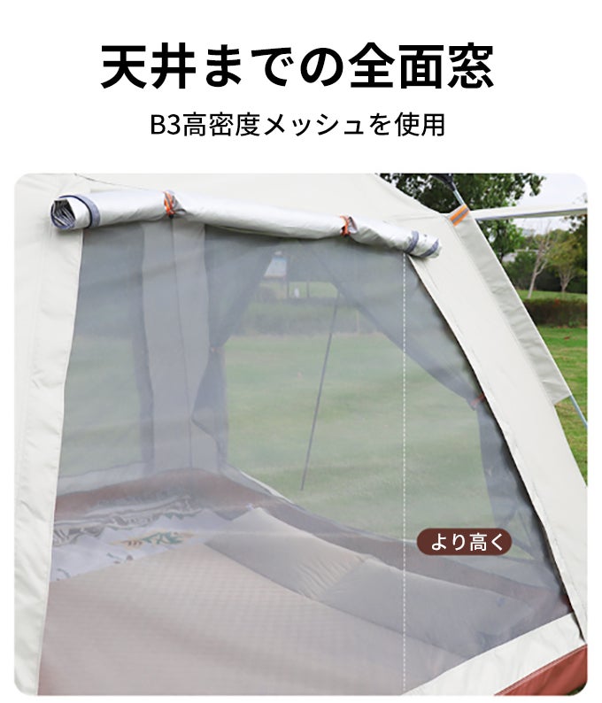 テント内部は、広々としたスペースが確保されており、快適なキャンプライフを送ることができます。さらに、安定した構造が採用されているため、強風にも強く悪天候でも安心して使用できます。また、2つのサイズが用意されており、ファミリーキャンプにも最適です。