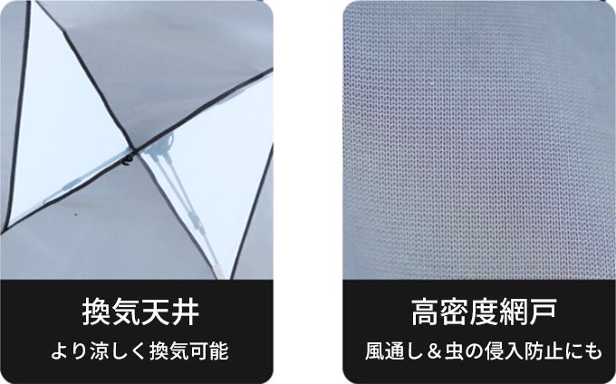 「Levoryeou」はドアや網戸にファスナーが付いており、別々に開閉することができます。四方や天井にも網戸が付いており、風通しや虫の侵入防止にも効果を発揮します。虫の多い季節でもストレスを感じることなく快適に過ごすことができます。