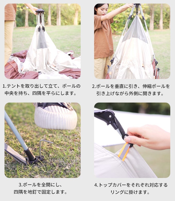 ・ポールを持ち上げるだけで、初心者でも簡単に設営可能です!